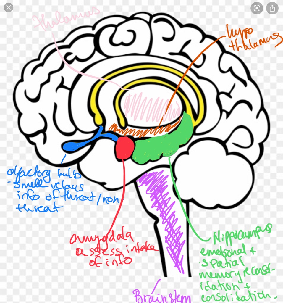It is stimulated when the external environment is processed via the amygdala13 with less response from the hippocampus14. This happens when we are in the face of actual danger, when we are triggered emotionally and when stress has caused us brain damage to the hippocampus and limbic system.